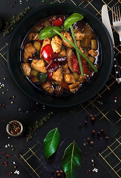 Chicken fillet in breading and tomato sweet and sour sauce, steamed basmati rice, bell peppers, pineapple, onions.